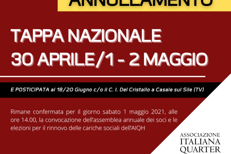 COSI' LA AIQH: "Per la salvaguardia di cavalli e cavalieri e per prepararsi al meglio sulle misure di prevenzione relative all’ EHV-1, l’AIQH ha deciso di annullare la tappa (30 aprile/ 1-2 Maggio) e di spostarla in data 18/20 Giugno c/o il C. I. Del Cristallo a Casale sul Sile (TV)".